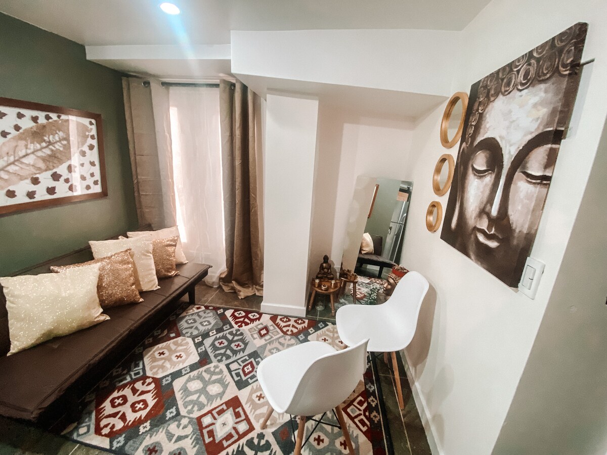 Disfruta de una experiencia de lujo en este céntrico y a la vez tranquilo alojamiento. Nuevo totalmente, un ambiente, ideal para una pareja, fácil acceso a transporte público. Variedad gastronómica solo a 200 m, Zona Rosa a 700 m y Zona G a 1.4 km. Cerca para eventos de Feria. Adecuado para home office, linda máquina de café. Las vistas de las fotos son reales desde el apto. Recomendado tomar un respiro desde la terraza del edificio.