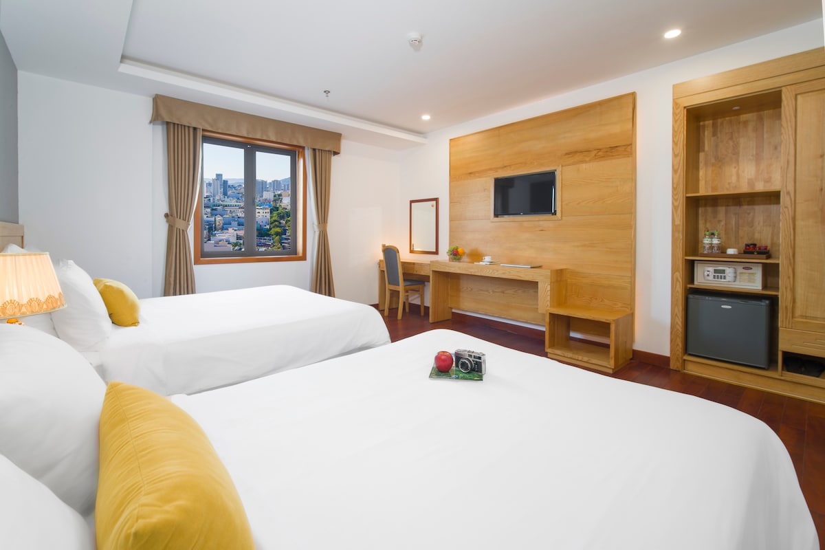 Amplio doble de lujo con vista parcial al mar, baño privado, desayuno incluido. Acceso gratuito al bar infinito en la azotea, la barra de cielo y el gimnasio. Se puede llegar fácilmente a pie a las playas de My Khe a solo 3 minutos, cerca del mercado nocturno An Thuong, a 3 km del centro de la ciudad. Incluía desayuno gratuito y servicios de limpieza. Puedes usar el servicio de lavandería con pago en recepción. La recepción está abierta las 24 horas, los 7 días de la semana, para ayudarte en cualquier momento.