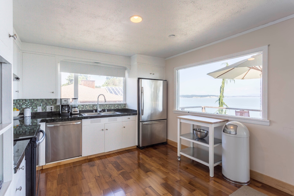 Increíble casa de playa de los años 50 frente al mar con paredes de ventanas y cautivadoras vistas de 180° del estrecho y las montañas. Este refugio del noroeste del Pacífico en la MEJOR playa privada de la isla ofrece la máxima privacidad y es conocido por sus impresionantes puestas de sol. Diviértete en la terraza envolvente o enciende el fuego. Experimenta el avistamiento de ballenas, la búsqueda de objetos en la playa, la pesca de camarones, cangrejos y almejas. Sea testigo de cómo nuestras águilas y garzas residentes se elevan. Reserva tu próxima escapada relajante en nuestro tranquilo paraíso frente al mar.