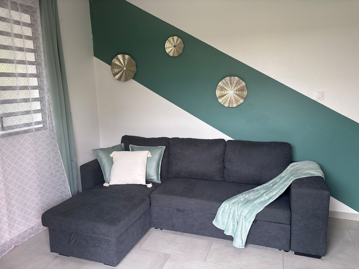 A 5 minutos del aeropuerto Félix Eboué Apartamento en casa unifamiliar en terreno privado vallado con puerta eléctrica. 1 dormitorio con cama de 140 x 190, 1 dormitorio con cama de 200 x 200, baño, inodoro separado, cocina equipada, bar americano en sala con sofá cama para 2 personas, mesa y sillas, televisión, ventilador, habitaciones con aire acondicionado. Gran terraza con mesa y bancos. Aparcamiento privado en propiedad vallada con puerta eléctrica. A 1/2 hora del centro de CAYENA.