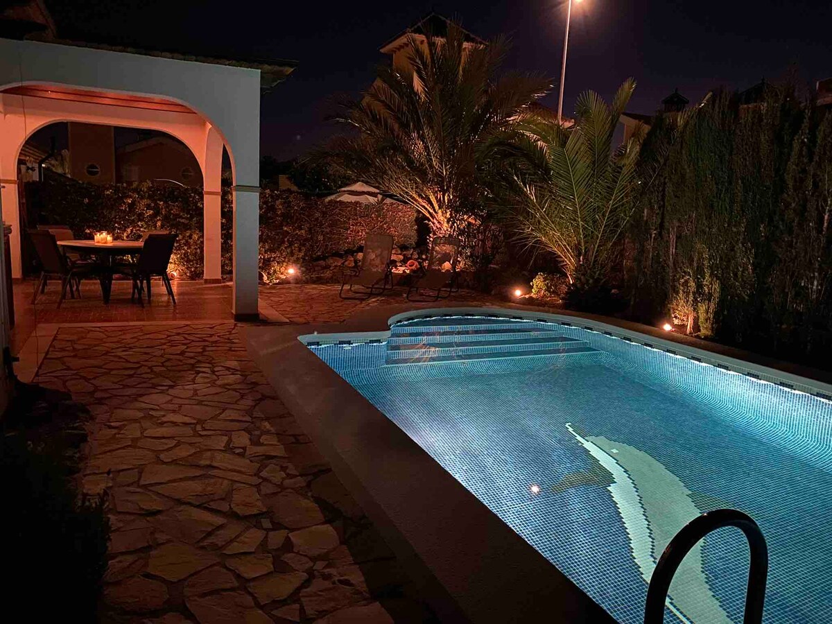 Villa completamente renovada y con todo el mobiliario a estrenar. Tres habitaciones con camas dobles, y dos baños completos. Espacioso salón con techo alto y tv de 55 pulgadas. Gran mesa de comedor interior. Cocina totalmente equipada. En el exterior: piscina iluminada por la noche, hamacas, comedor para diez personas, barbacoa, y hasta un pequeño putting green.
