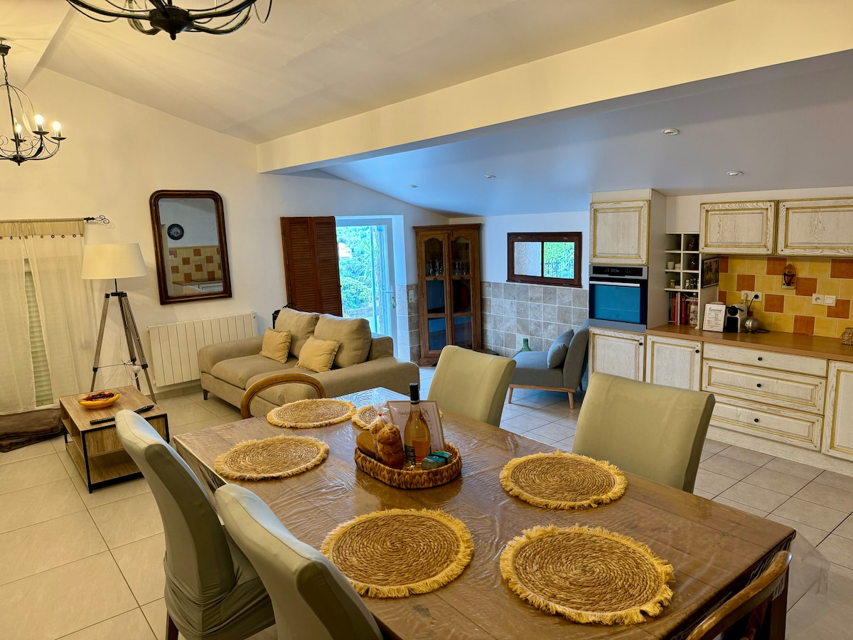 Se pone a su disposición un apartamento de 36 M2 y una terraza de 15 M2 en la planta baja adyacente a otro apartamento separado por una pared el acceso directo a la cala se encuentra a 3 m de la terraza por una escalera. Hay un aire acondicionado reversible para una verdadera comodidad tanto en verano como en invierno. Apartamento funcional (lavadora, televisión, wifi, etc.) Se proporciona ropa de cama una plaza de aparcamiento prevista en frente de la casa De mayo a octubre, los alquileres son de sábado a sábado.