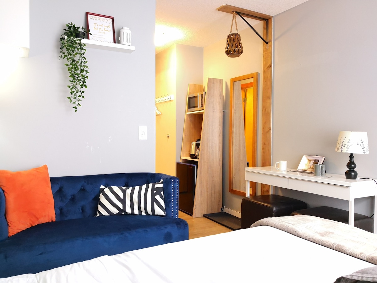 Esta HABITACIÓN DE HOTEL está en Silver Creek Lodge. No es un gran espacio, las vistas despejadas a las montañas de tres hermanas, el pico HA Ling y la cordillera Rundle. NO hay COCINA ni balcón disponibles disponibles. Wifi, mini refrigerador, TV inteligente, microondas, cafetera de goteo, tostadora disponible. A pocos minutos a pie de McDonald 's, Tim Hortons. La bañera de hidromasaje , el GIMNASIO, la sala de vapor son compartidos , el estacionamiento subterráneo gratuito es por orden de llegada . Wild Orchid Bistro & Sushi Lounge sirve cocina de fusión asiática en el piso principal. El spa Bodhi Tree está en el lugar