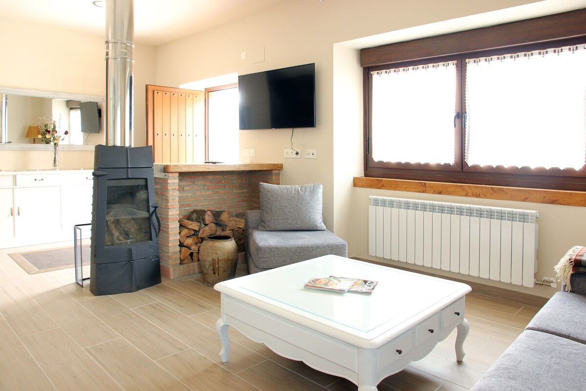 Encantador alojamiento en casa de piedra. Cocina abierta a espacioso salón comedor y zona de bar. Habitación amplia con dos camas dobles, sofá cama doble, armarios, cómodas y escritorio. Estufa de pellets, calefacción, Alexa, wifi, cinta de correr, juegos de mesa. Cocina y baño completo, secador, plancha de pelo y plancha de ropa. Cuna con ropa de cama completa, trona, bañera de bebé. Aparcamiento en la puerta. Muy tranquilo y céntrico. El pueblo tiene comercios y mercadillo los sábados.