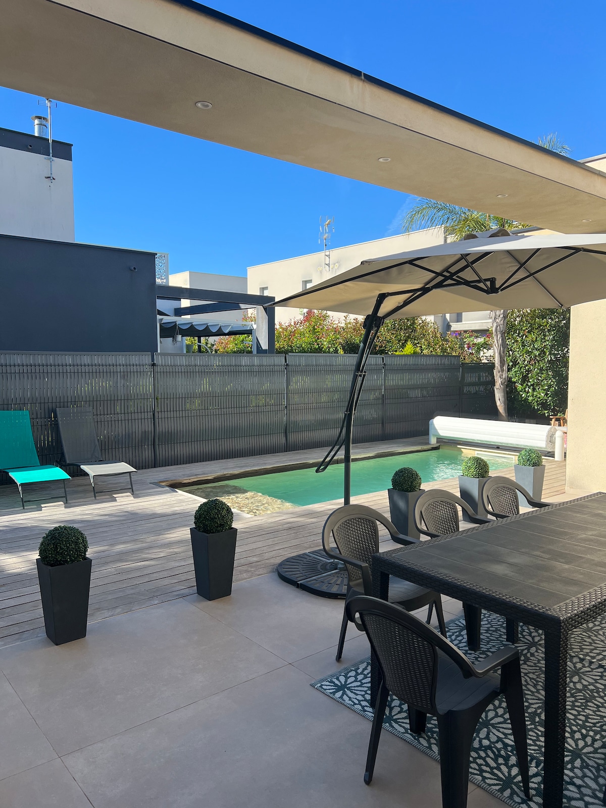 •Maison moderne, située dans un endroit calme, proche de toutes commodités, ainsi que des plages à moins de 5 km. - piscine chauffée ( jusqu’à 29 degrés ) - jacuzzi ( 6 places ) - 4 Lits doubles + 1 canapé lit convertible ( couchages pour 10 adultes) - Deux salle de bains, 2 WC -WIFI, internet, chrome cast - 4 TV ( dans 3 chambres et salon ) - Barbecue - Salon de jardin - Cuisine entièrement équipée