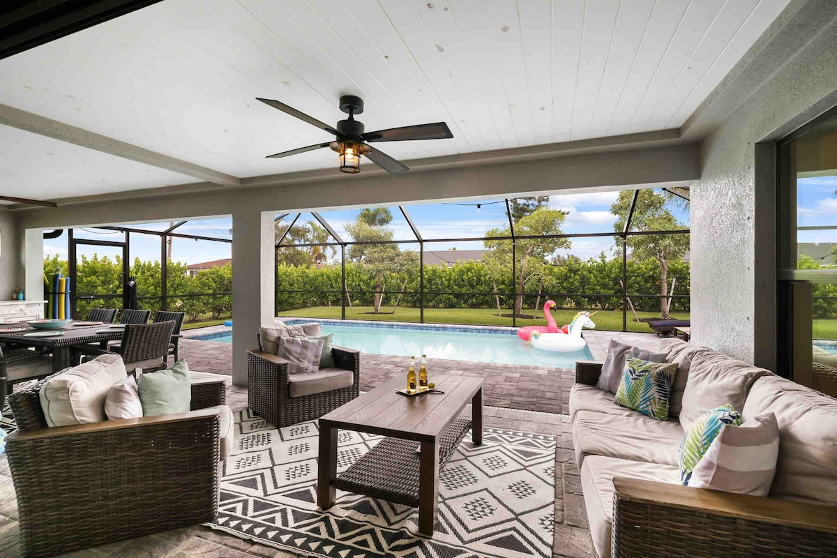 El estado del sol está llamando, y la vida de lujo te espera en esta moderna y espaciosa casa de Cape Coral. Trae a tu familia a esta casa de 4 dormitorios y 3 baños y disfruta de sus amplias comodidades. Esta casa cuenta con una cocina totalmente equipada, TV inteligente en todas las habitaciones y una chimenea eléctrica. Relájate todo el día en el patio privado o salta a la piscina si necesitas refrescarte. Prueba los restaurantes locales justo al final de la calle, te bronceas en la playa o simplemente disfruta de una comida al aire libre en la parrilla. ¡Tu próxima escapada te espera!