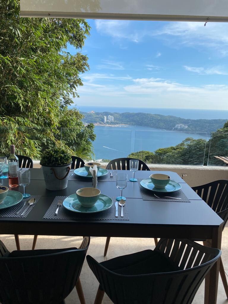 Pent House PET Friendly único en Acapulco con una vista a 360 grados. Alberca panorámica que permite gozar del show de los clavadistas de la Quebrada. Area de sala y comedor totalmente abierta hacia el exterior con terraza amplia. Cocina equipada y tres recamaras cómodas cada una con su respectivo baño. La decoración del PH es de estilo mediterráneo. El espacio goza de la ventilación natural de la brisa marina lo cual da una sensación de bien estar.