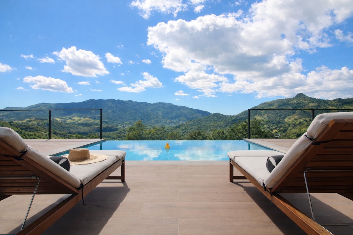 Mansión en la Cima de la Montaña en Manuel Antonio. Piscina y jacuzzi privados con vistas impresionantes. Aire acondicionado, comunidad cerrada y duchas al aire libre. Diseñada por famoso arquitecto local, esta casa es la mejor en Manuel Antonio. Cocina completa, loft con vistas, pared de vidrio retráctil para disfrutar de la brisa marina. A solo 8 min del Parque Nacional y 3 min de Marina Pez Vela. ¡Experiencia única!