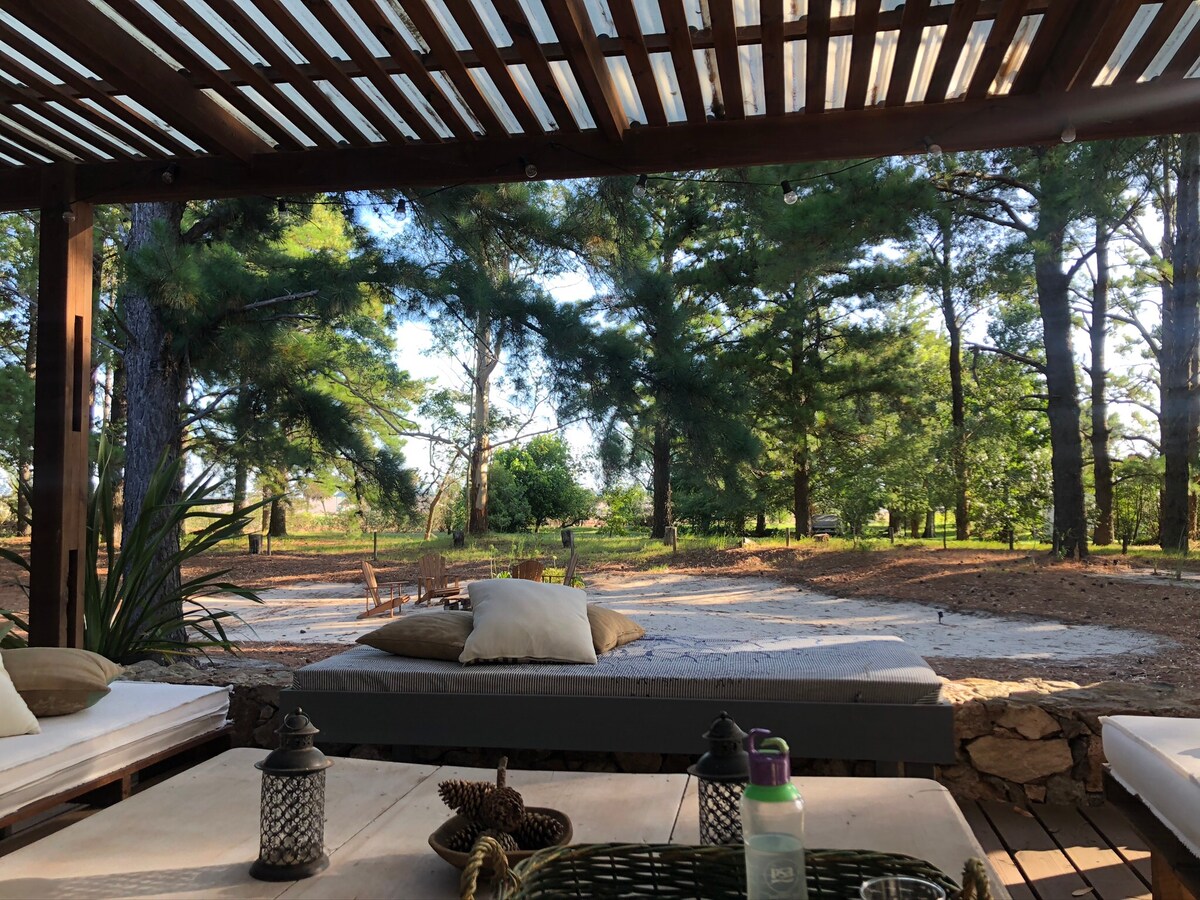 Ubicada dentro del exclusivo emprendimiento "Tierra de caballos" en Carmelo, esta chacra rural se encuentra rodeada de 2 hectareas de bosque de pinos autoctonos, lagos y terrenos con desniveles naturales. Ideal para buscar tranquilidad y descanso. Los huespedes tienen acceso a las instalaciones del club de campo El Faro (Pileta, Playa, Puerto, canchas de tenis, paddle, futbol, juegos para niños)