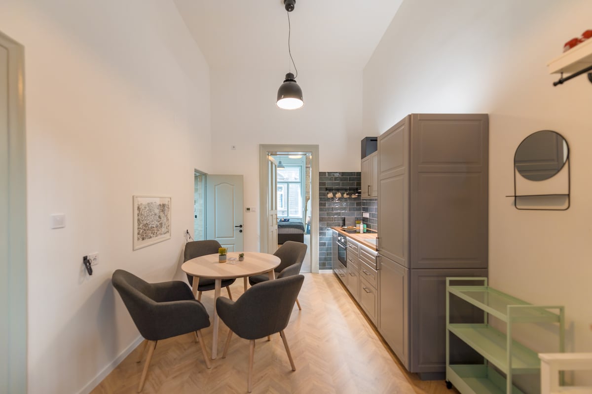 ✨ Impresionante refugio en el último piso en el corazón de Budapest, ¡perfecto para parejas, familias o grupos de hasta 4 personas! Cuenta con un balcón de 4 metros con juego de comedor y tumbona, que ofrece vistas panorámicas desde el castillo de Buda hasta MÜPA. El lujo moderno se une a una ubicación privilegiada cerca del muelle de VIKING CRUISE y el baño Gellért. Totalmente equipado con cama tamaño queen y sofá cama. 🌟