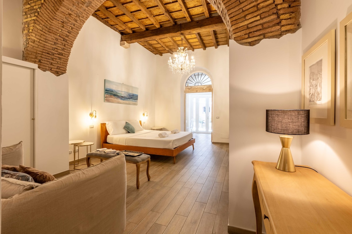 Amplio apartamento en Piazza Campo de' Fiori. El punto de partida perfecto para explorar el centro histórico, te encontrarás inmerso en el vibrante ambiente de una de las plazas más pintorescas de Roma, con el mercado durante el día y un ambiente animado por la noche. El apartamento está en la planta baja, un dormitorio con sala de estar (mismo espacio), un baño, una cocina totalmente equipada y un increíble jardín soleado, todo renovado. El diseño de la casa se combina con muebles modernos y arcos romanos antiguos.