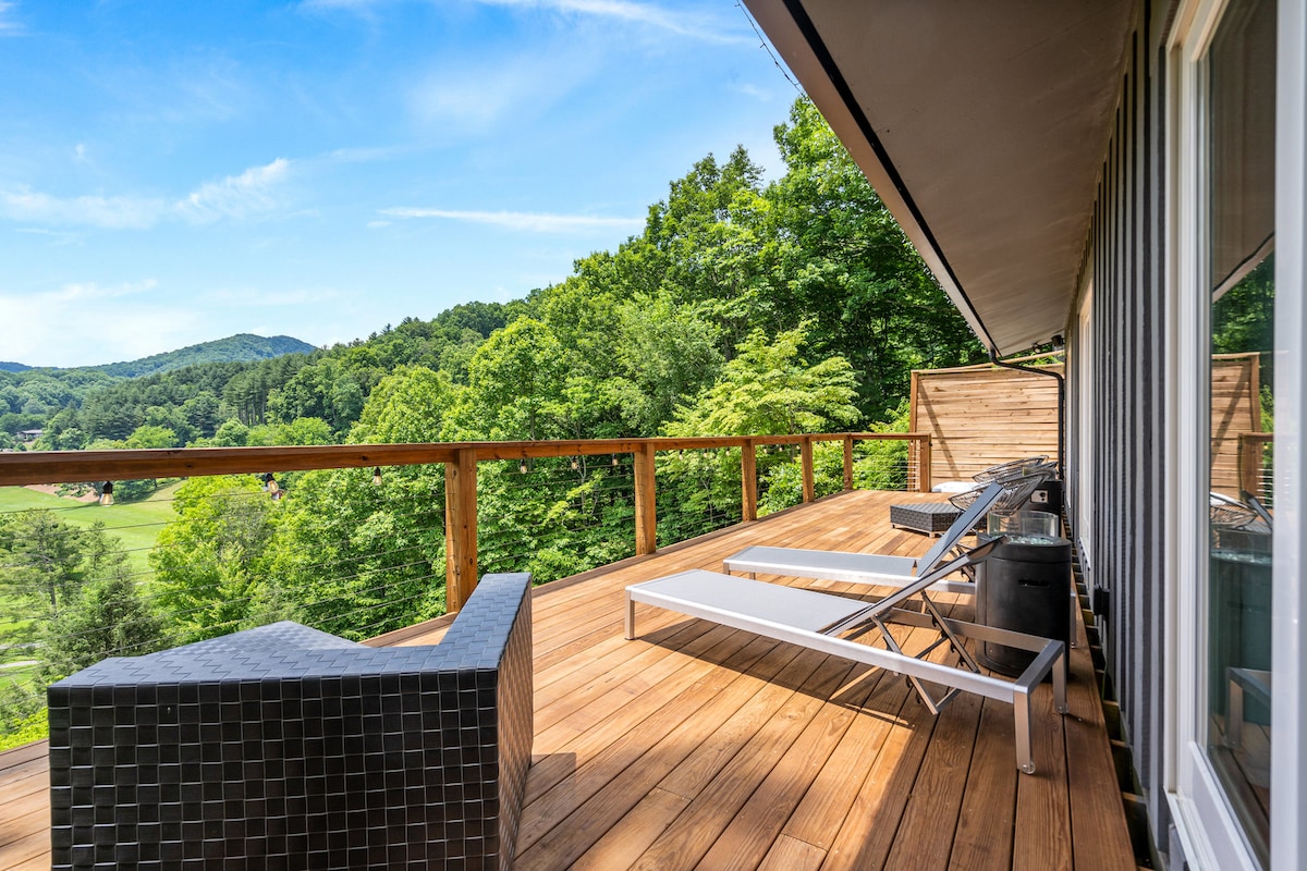 El refugio de montaña de mediados de siglo. Las vistas panorámicas a la montaña y al campo de golf le dan a esta hermosa casa una sensación de lujo. Esta casa se encuentra a una milla del Maggie Valley Country Club (campo de golf y restaurante abierto al público), arroyos de truchas y rutas de senderismo. Tanto si eres un entusiasta del aire libre que busca esquiar en Cataloochee, hacer una excursión de un día a Asheville para disfrutar de las cervecerías, Cherokee para visitar el casino o conducir por la Blue Ridge Parkway, esta es la escapada definitiva. ¡Capacidad para 6 personas con más de 1500 pies cuadrados de terraza al aire libre!
