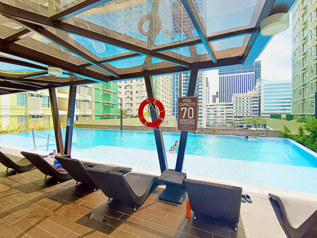 📍Midpoint Residences, Banilad, Mandaue City 2 adultos, 1 niño - Cama doble (buena para dos). - Armario incorporado. - Sofá cama (válido para una persona). - Estufa de inducción - Televisión inteligente con Netflix, Disney Plus, etc. - WI-FI. - Utensilios de cocina y comedor. - Juegos de mesa - Plancha y plancha. - Soplador de pelo. - Mesa alta con vistas a la ciudad. Las comodidades del condominio incluyen: - Gimnasio - Parrilla. - Media cancha de baloncesto - Piscina GRATUITA. - Salón en la azotea Estacionamiento gratuito válido solo durante 3 horas. Estacionamiento gratuito para motocicletas