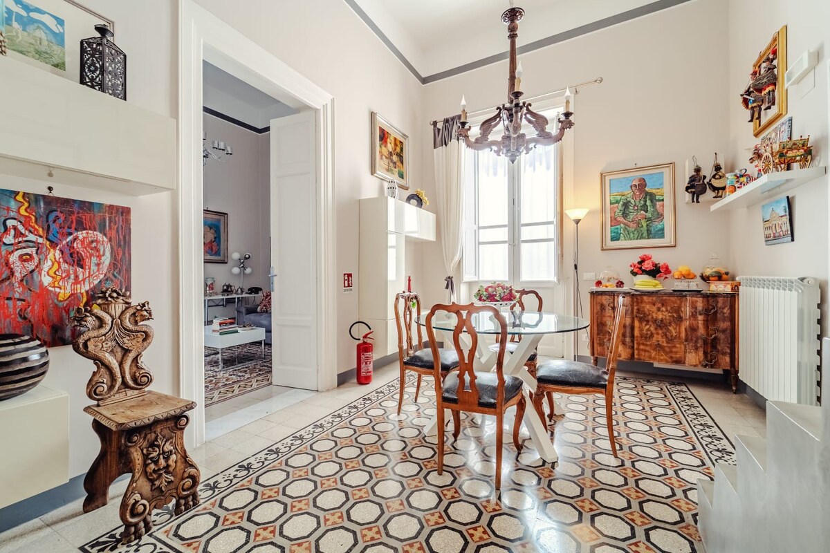 Apartamento situado en el corazón del centro histórico, en la zona de Cassaro Alto, en una zona tranquila, a pocos pasos de la Catedral y del paseo peatonal árabe-normando, los cuatro cantos, el Teatro Massimo, la Capilla Palatina, los mercados de Ballarò, Capo y Vucciria El apartamento está situado en la primera planta, una planta noble con techo con frescos, pared de piedra, salón cocina de mampostería con mayólica original, puerta y armario de estilo modernista siciliano, con balcones con vistas a la catedral.