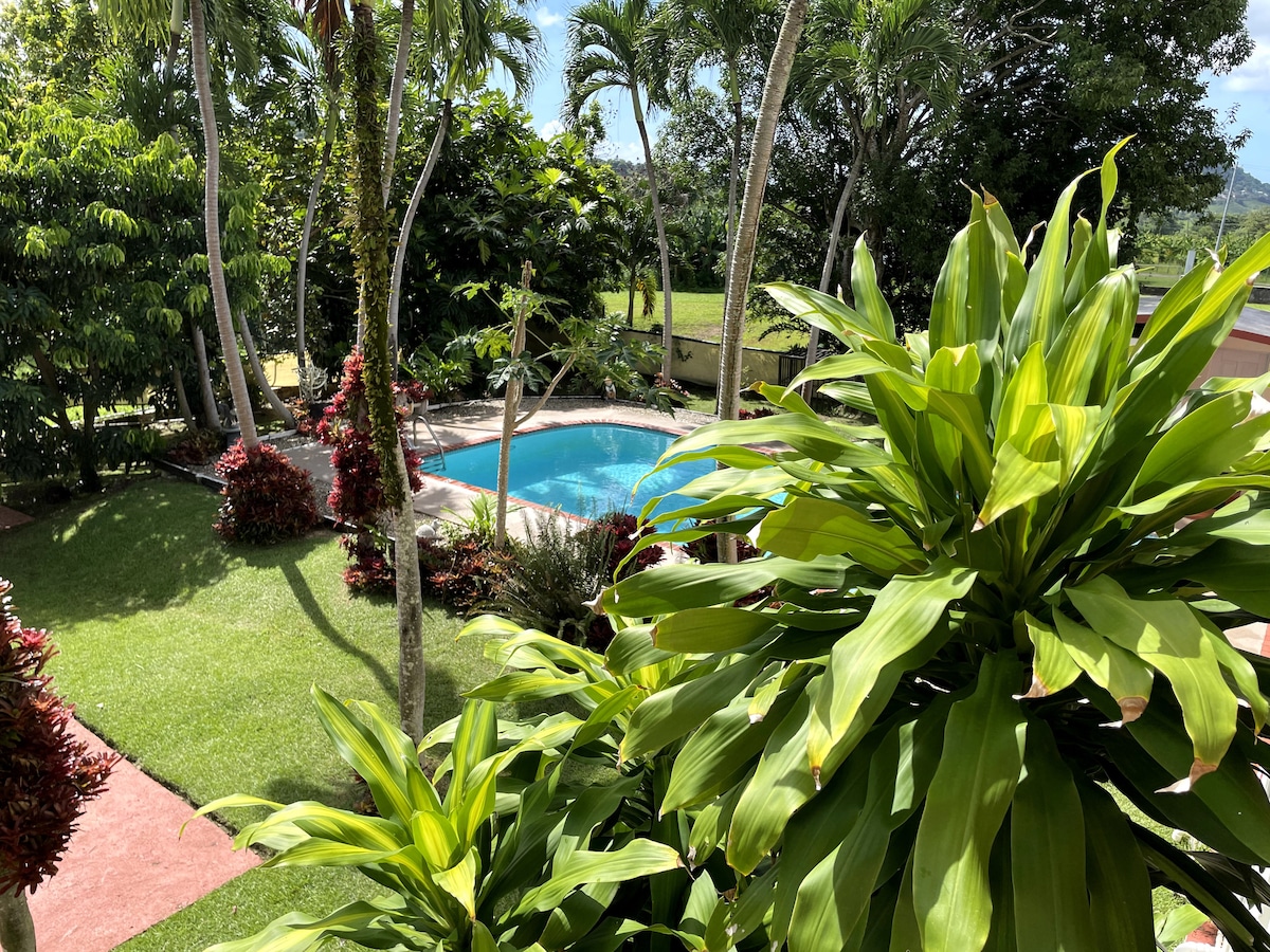 Experimenta la selva tropical de Puerto Rico en nuestro apartamento en la cima de la montaña. Coqui y los búhos crean un fondo natural por la noche. 1 apartamento completo con estacionamiento en el garaje. Cocina completa, dormitorio completo, sala de estar se convierte en una cama tamaño queen. 18' piscina con vista al mar 12' gazebo. 3 acres de senderos para caminar, cama elástica y tirolina para niños. equipo de kayak y playa. transporte a ferry disponible. Nuestro barco también está disponible buscar una aventura en el agua. muy apto para niños - debe estar bien con los perros.