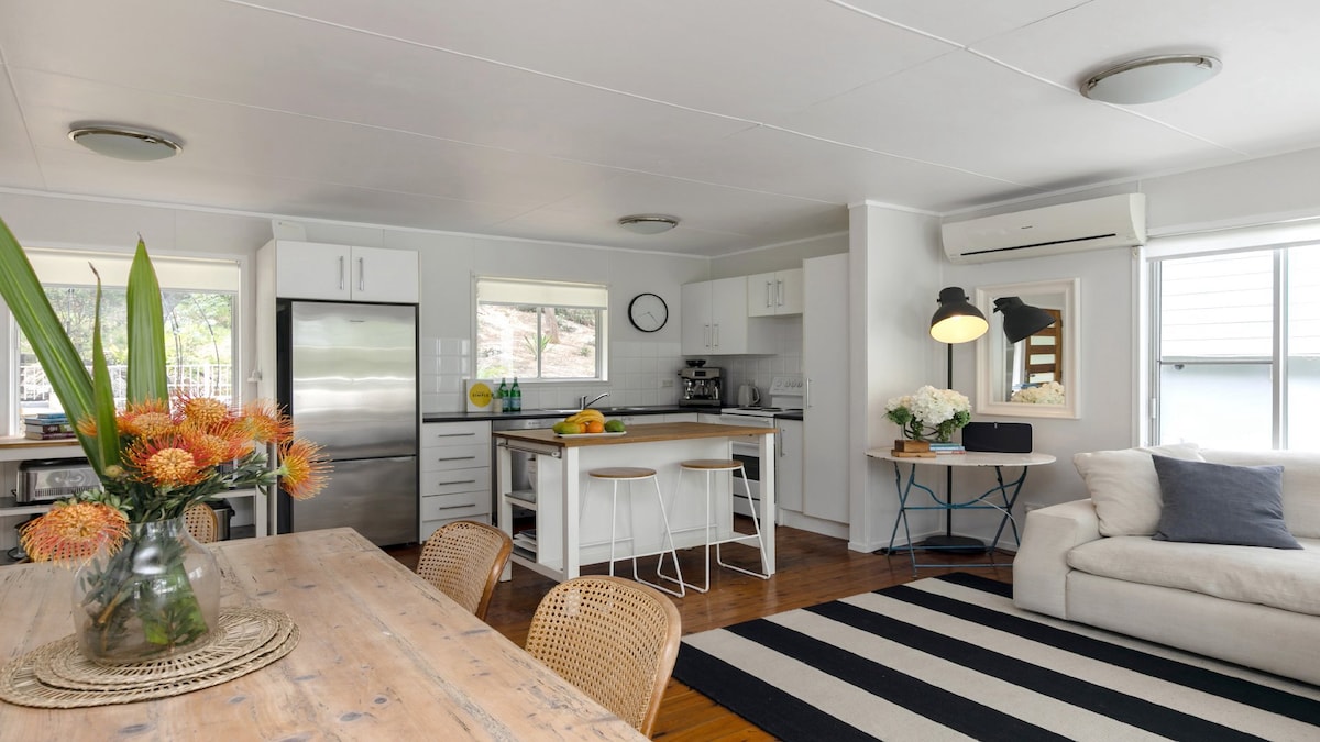 Beachside Retreat Granny Flat🏝️☀️ This affordable, detached, cosy, self-contained granny flat is the perfect convenient base for those who love to explore. Just moments from the beach, it offers a private and comfortable retreat with home-style amenities, including a fully equipped kitchenette, lounge w/ TV, bathroom with washing machine & a huge yard. The flat also features a king bed and a separate bedroom with a double bed and space for an extra mattress. Experience the coast like a local.