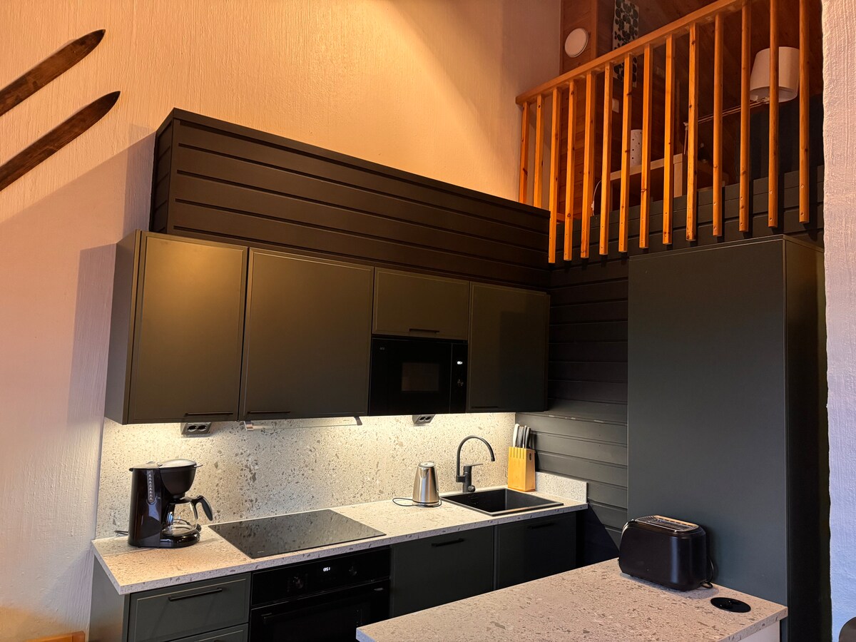 Lomahimos 33 for 6 persons 46 m² + loft 16 m2 A cozy semi-detached cottage in the middle of Himos. Downstairs there is a living area, a new open kitchen, a bedroom and sauna and toilet. Upstairs is an open loft with 4 single beds. The terrace has a jacuzzi and patio furniture. Lake view from the cottage.The living room has a 42-inch TV and fireplace. Wifi is for the guests’ use. The cottage has duvets and pillows. If necessary, you can order bedding from HimosLomat. Airconditioning is available.