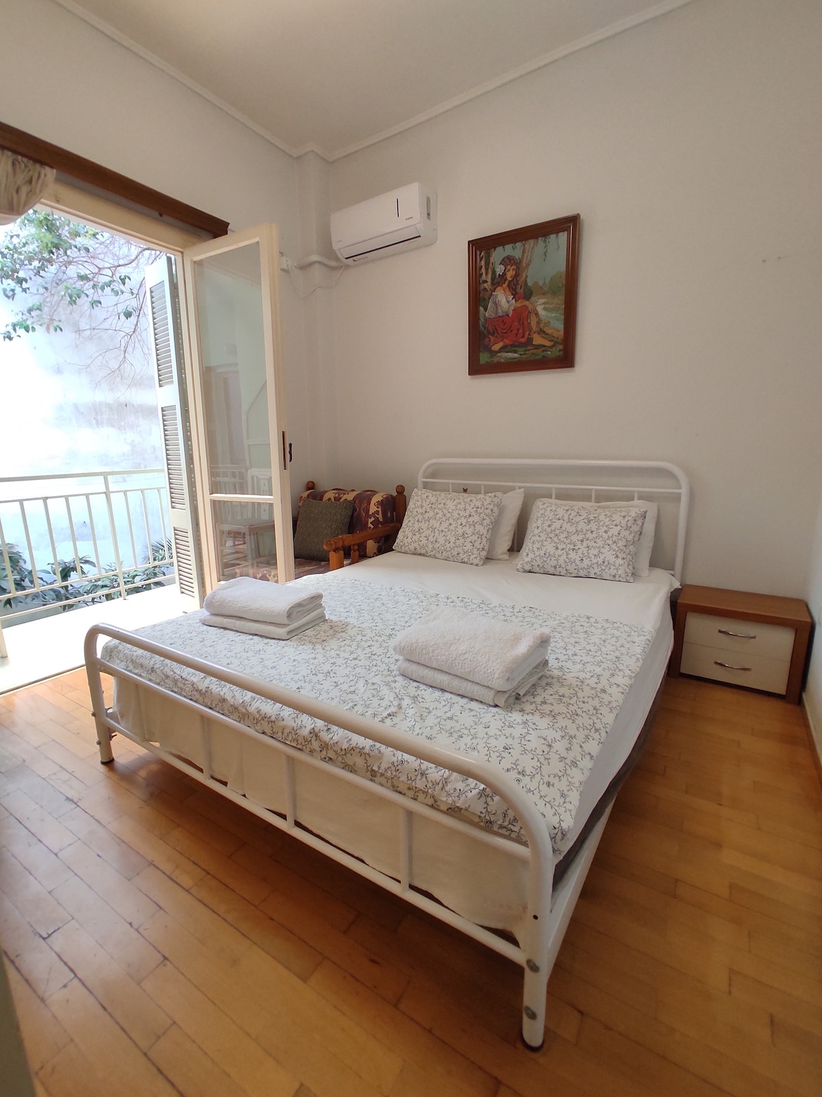Habitación luminosa con balcón cerca del metro Disfruta de una estancia acogedora en nuestra casa de huéspedes familiar en Atenas, a pocos pasos del metro de Agios Nikolaos. La habitación cuenta con aire acondicionado, cocina privada, nevera, lavadora, armario y un balcón soleado, perfecto para relajarse después de explorar la ciudad.