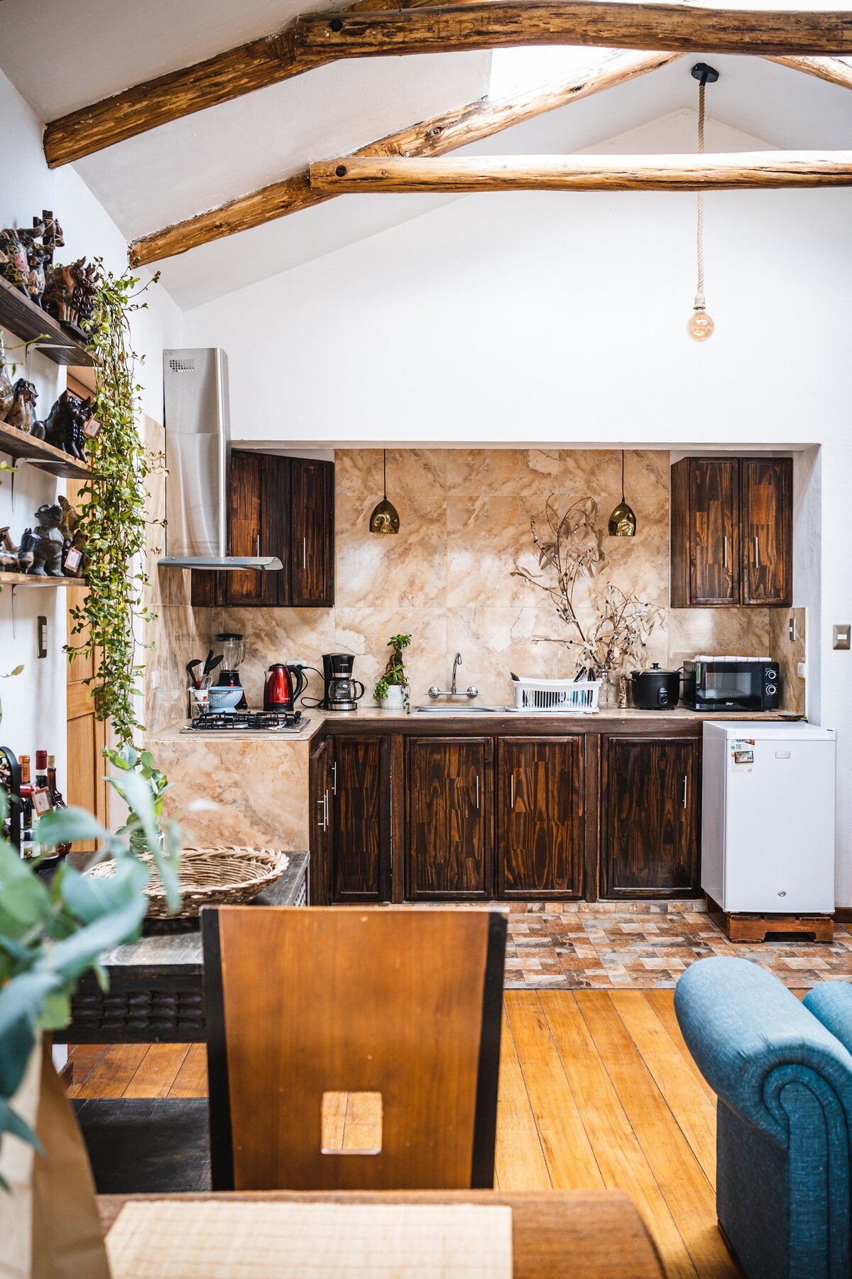 Calidez & Calma en nuestro Apartamento rústico con troncos de eucalipto,luz natural, piso de madera diseñado con muebles coloniales y belleza artesanal en cada espacio Despierte con el canto de las aves en nuestra Habitación con SmartTv55' Cable & Netflix Disfrute nuestro Balcón con cómodo sillón,vista a las montañas y al horizonte de la Ciudad Relajese en nuentro jardín acompañado de un café,libro Cocina full equipada Terrazas de piedra con Fogata Área de BBQ Garage gratuito dentro de propiedad