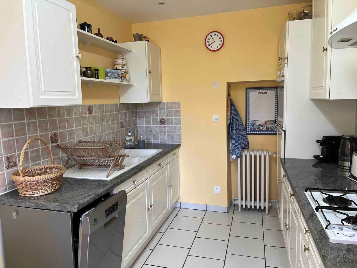 Tu historia en la Historia. Venga a alojarse en el segundo piso de la mansión en un elegante apartamento de 65m2. Este apartamento tiene una vista clara de la campiña circundante, su decoración refinada invita a la calma y al descanso. La sala de estar ofrece un cómodo salón y una mesa de comedor, la cocina está equipada, el baño espacioso y agradable. Hay dos habitaciones, cada una equipada con una cama tamaño queen de calidad hotelera.