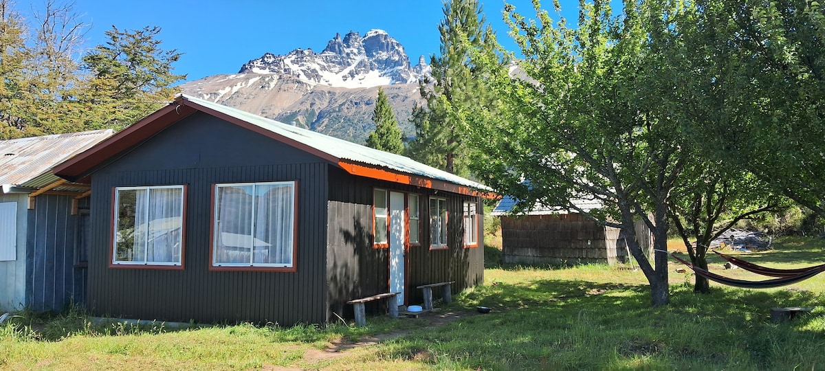 Cabaña a 700 mts de Villa Cerro Castillo, a los pies del Parque Nacional y pasos del sendero de trekking a la Laguna, Rio Ibañez, rutas de escalada, senderos de bicicleta y cabalgatas. 1 habitacion en el primer piso y otra en el segundo piso,1 baño,Sala comedor con cocina pequeña integrada. 2 paxs ( max 4). Impresionantes vistas al Cerro Castillo con orilla al Estero del Bosque. Ideal para 2 personas que quieran disfrutar de la naturaleza y actividades al aire libre.