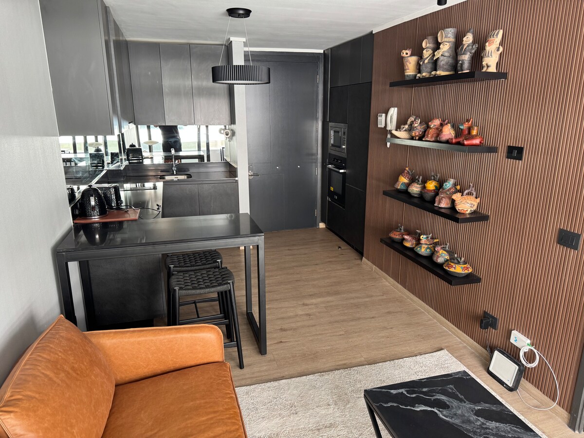 Estudio moderno nuevo y full equipado, único, con estilo propio, acogedor, con terraza, piscina infinita, gimnasio y parking privado, dentro de la zona más segura y exclusiva de Santiago: Las Condes. -Cama KING con ropa de cama -Parking incluido -Baño con amenities de cortesía (jabón, shampoo, papel higiénico) -Comedor con cocina, refrigerador, microondas y amenities (café, te, sal, azúcar, aceite). -2 Cafeteras (NESPRESSO-filtro) -Aire Acondicionado -WiFi -Smart TV -Lavandería.