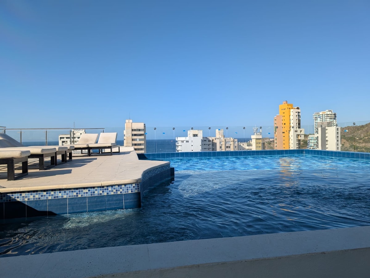 ¡Dirígete a la azotea donde podrás relajarte en dos piscinas! El apartamento está a poca distancia a pie (unos 5 minutos) de la zona de la bahía, la playa y la mejor gastronomía y cultura que la ciudad tiene para ofrecer. ¡No dudes en ponerte en contacto con nosotros para obtener recomendaciones! La ubicación céntrica del apartamento es perfecta para visitar las playas locales, así como las atracciones cercanas más famosas: Parque Tayrona, Palomino, Minca y Ciudad Perdida (¡por nombrar algunas!).