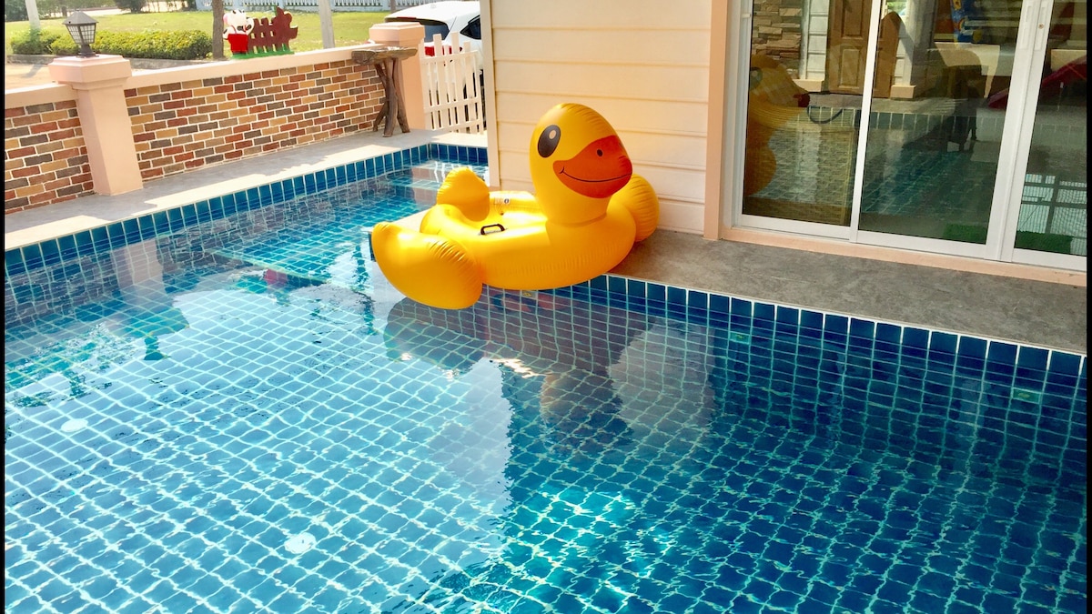 La casa está cerca de la ciudad de Hua Hin con todas las instalaciones. Perfecto para actividades familiares y de amigos. * * * Detalles del alojamiento - A menos de 10 minutos del mar. - Cerca de restaurantes, cafeterías, cervecerías, mercado. - Puedes pedir entrega, servicio y comida en tu puerta. - Piscina - Juguetes acuáticos - Slider grande. - Mesa de billar de 7 pies. - Karaoke - Televisión inteligente - Wi-Fi gratuito. - Toallas de baño. - Calentador de agua. - Aire acondicionado. - Barbacoa, estufa de gas y estufa eléctrica. - Mesa de banco larga. - Lavador. - Secador de pelo. - vistas a las montañas