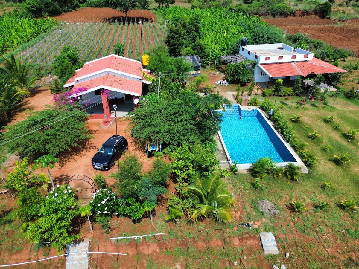 Welcome to our 8-acre private farm escape! All of it surrounded by the Anchetty Forest Range is yours, given to only one group at a time. Two dreamy homes—a Mangalore-style A-frame cottage and a spacious 2BHK with 360° hill views await your stay. Take a dip in the pool , hang with playful doggies, and gaze at endless greenery across farmlands and forest. Spot peacocks, colorful birds, or even a wild boar. The perfect place to unwind on your way to Hogenakkal Falls for epic views !