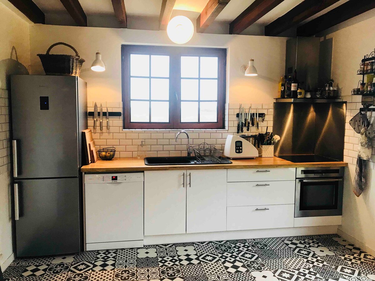 Bonita casa de entramado de madera, reformada de arriba abajo en 2010 con todas las comodidades, pero conservando toda su alma. Un lugar donde todo el mundo parece sentirse bien, con días de sol en el gran jardín orientado al sur, o cerca de la gran chimenea en invierno. 2 habitaciones acogedoras en el 1.º piso (1 con cama doble y 1 con 2 camas individuales), y abajo, después del gran salón/comedor de 50 m2, una pequeña oficina con 1 cama individual y una gran cocina equipada llena de luz. A pronto