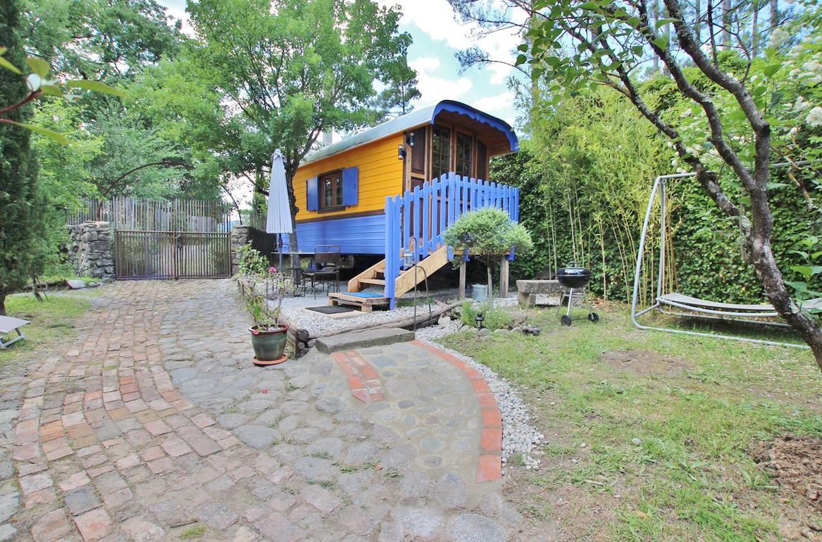 Encantadora caravana de circo de los años 50 decorada con mucho cariño. 3 m de ancho por 11 m de largo, rodeada por una terraza con vistas a un hermoso jardín. Una estufa de leña para mantenerse caliente en invierno, un dormitorio con una cama doble, una gran ducha, una sala de estar con un sofá cama que puede acomodar cómodamente a una persona más. ¡Ideal para fines de semana en pareja! ¡Hablamos inglés, todos son bienvenidos!