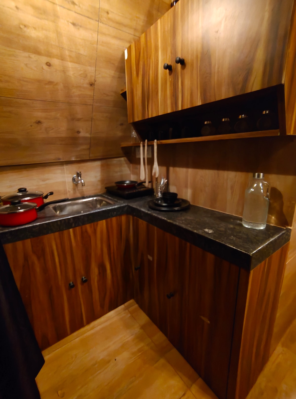 Escápate a nuestra acogedora cabaña, donde el encanto rústico se encuentra con la comodidad moderna en medio de la encantadora belleza de los árboles de Nilgiri. Disfruta de la calidez de la madera que te envuelve en un sentido de tranquilidad, creando el ambiente perfecto para relajarte. Nuestro espacio cuidadosamente diseñado cuenta con una pequeña cocina, donde podrás cocinar mientras te sumerges en las impresionantes vistas panorámicas a través del balcón de pie. Buscando aventura o simplemente una escapada tranquila o romántica, ¡nuestra cabaña es para ti!