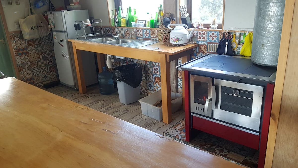 Ven a quedarte en una tinyhouse de 26 m², diseñada y construida a mano por nosotros. Está totalmente equipada e incluye acceso a un área común con fogón, parrilla y tinaja con agua de lluvia. La tinaja se paga aparte directamente en el lugar. La Pichi es ideal para dos personas, con cama de dos plazas, y puede alojar a una tercera en un pouf en la sala de estar. El espacio principal cuenta con estufa a leña, cocina americana y vista panorámica a la laguna.