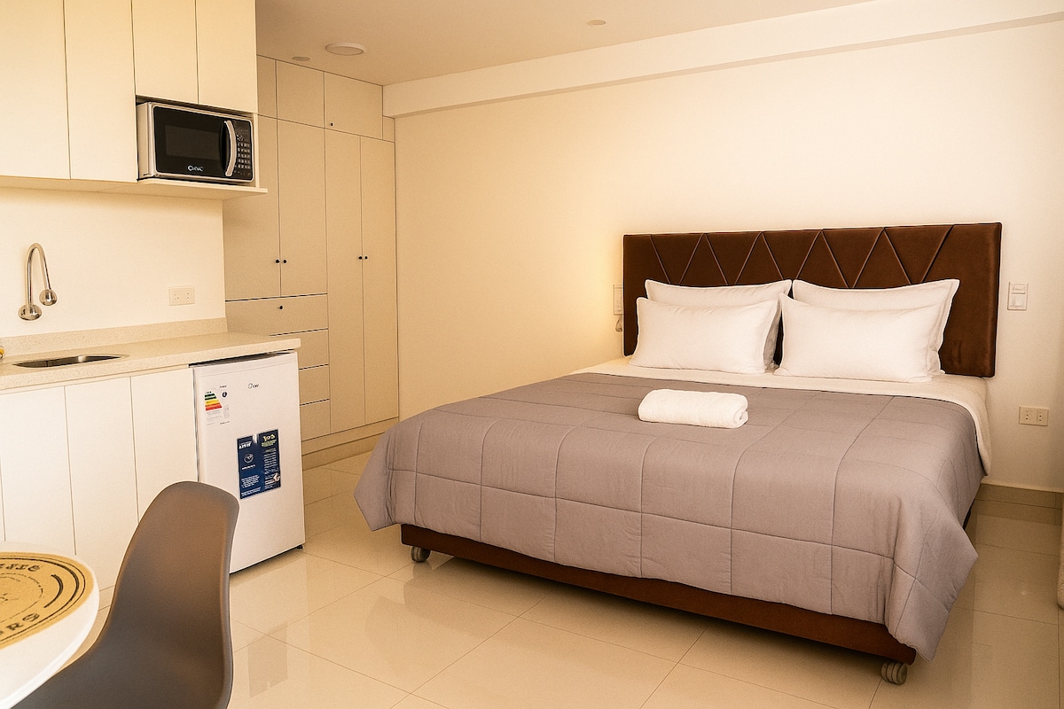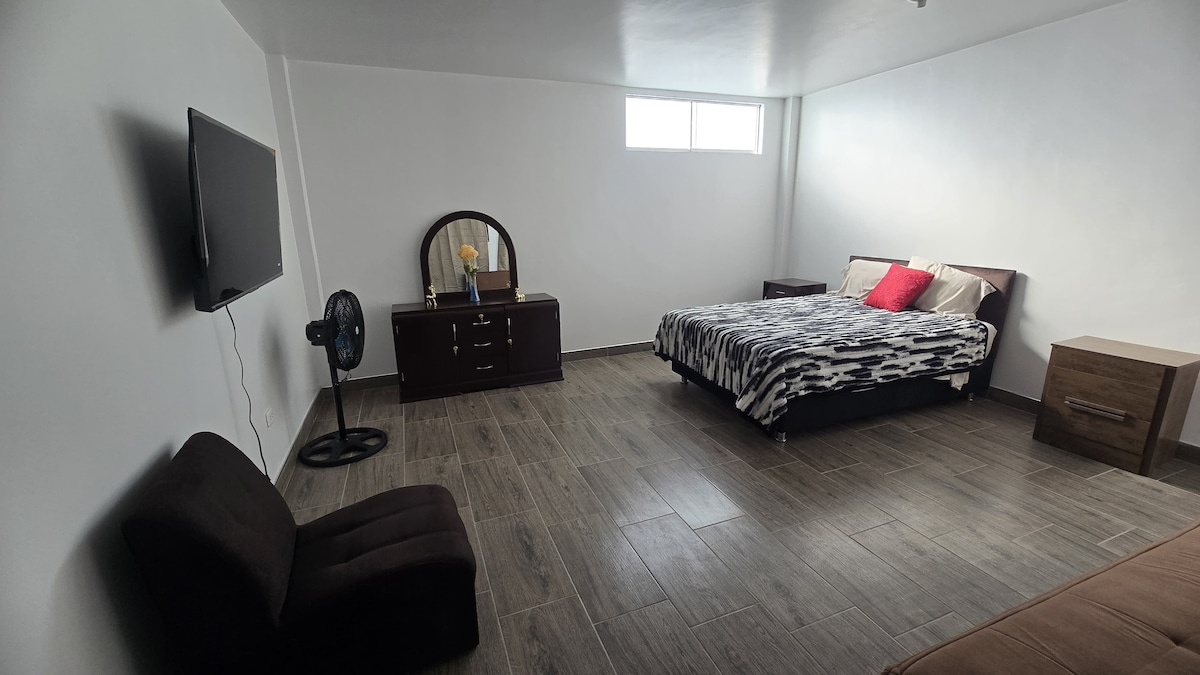 Disfruta una estadía moderna y tranquila en nuestra Suite Queen premium, ideal para parejas y viajes de trabajo. Ambiente elegante, iluminado y confortable, con cama Queen, baño privado, cocina equipada, mesa comedor, Smart TV y WiFi. Ubicada en zona residencial segura, con estacionamiento interno y patio amplio. A solo 5 min del centro de Chincha y 8 min de MegaPlaza. Confort, privacidad y estilo en Urban Suites Chincha. Perfecta para estadías cortas o largas.