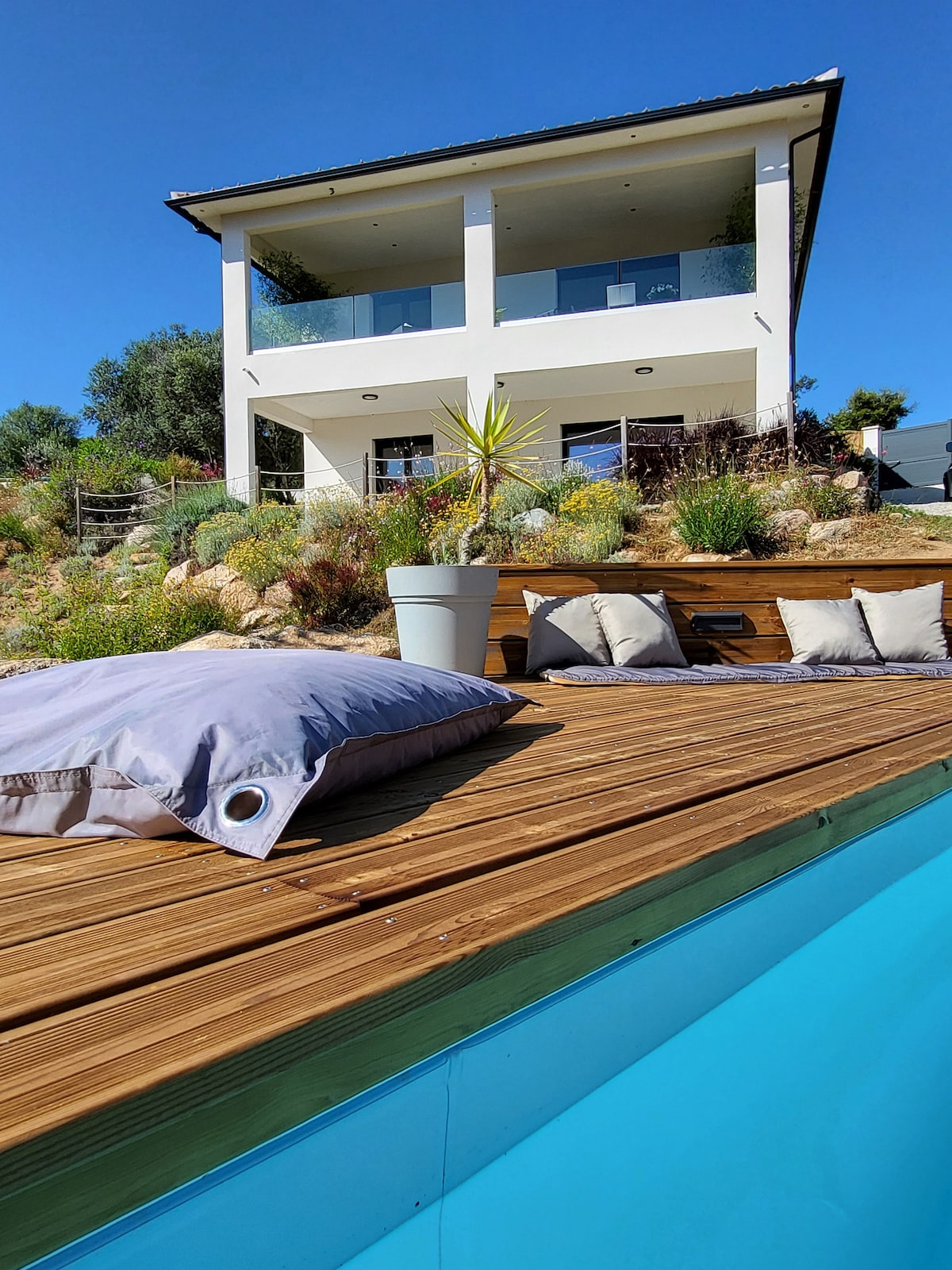 La Villa Serenita, un entorno bucólico en el interior de Ajaccio, es una invitación a disfrutar de la dulzura de la vida sureña. A 6 km del aeropuerto, de las primeras playas y del centro de la ciudad. Ideal para descubrir Ajaccio y su región disfrutando de los placeres de una casa de vacaciones agradable y tranquila con aire acondicionado, spa y piscina climatizada. Auténtica y elegante, rodeada de un gran jardín entre praderas y matorrales donde la vida se desarrolla dentro y fuera. ¡Un remanso de paz que huele a Córcega y a vacaciones!