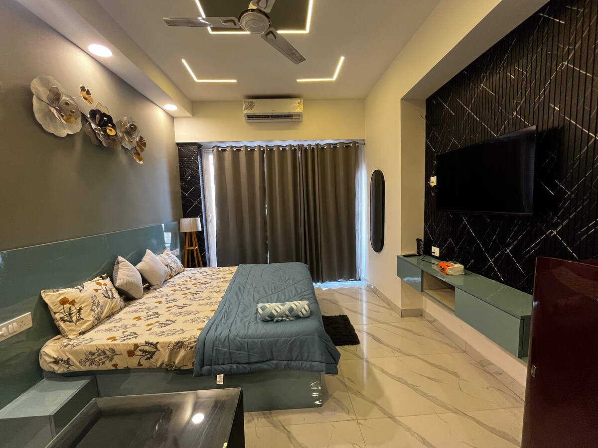 Nuestro apartamento de 2 dormitorios de nueva construcción combina la comodidad moderna con el encanto natural. El espacio cuenta con 2 dormitorios serenos con camas tamaño queen, una amplia sala de estar, una cocina bien equipada, 2 baños: uno adjunto al dormitorio principal y otro accesible desde la sala de estar y el segundo dormitorio y un balcón en forma de L que ofrece excelentes vistas de la ciudad. ¡La propiedad se encuentra cerca de un centro comercial prémium en Noida! Esta ubicación bien situada te ofrece la comodidad de tiendas, cafeterías y entretenimiento.