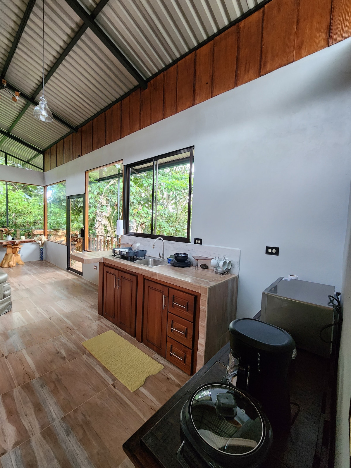 Apartamento tipo estudio de alta gama con una gran terraza con vistas al río. Ubicado en un exuberante jardín tropical, con acceso privado al río y varios estanques. Date un chapuzón o elige la piscina de inmersión. Ideal para escapadas románticas, observación de aves y relajarse después de largas caminatas. Cuenta con cocina completa, aparcamiento privado e internet de alta velocidad. Cerca del sendero de Chirripó y de la reserva natural de Cloudbridge, varios restaurantes y un pequeño supermercado a poca distancia a pie.