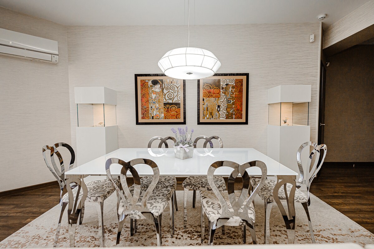 Enjoy a stylish experience at this centrally-located place. Brand new apartment located right on Stefan cel Mare street, in front of Ministry of Internal Affairs. Fully equipped for your comfort and styled in minimalist design, it will make you feel like home. It is at the 2nd floor, all windows are facing the main street, displaying a beautiful and pleasant city view, meanwhile offering the maximum noise reduction with our blackout electrical blinds and triple glass windows.