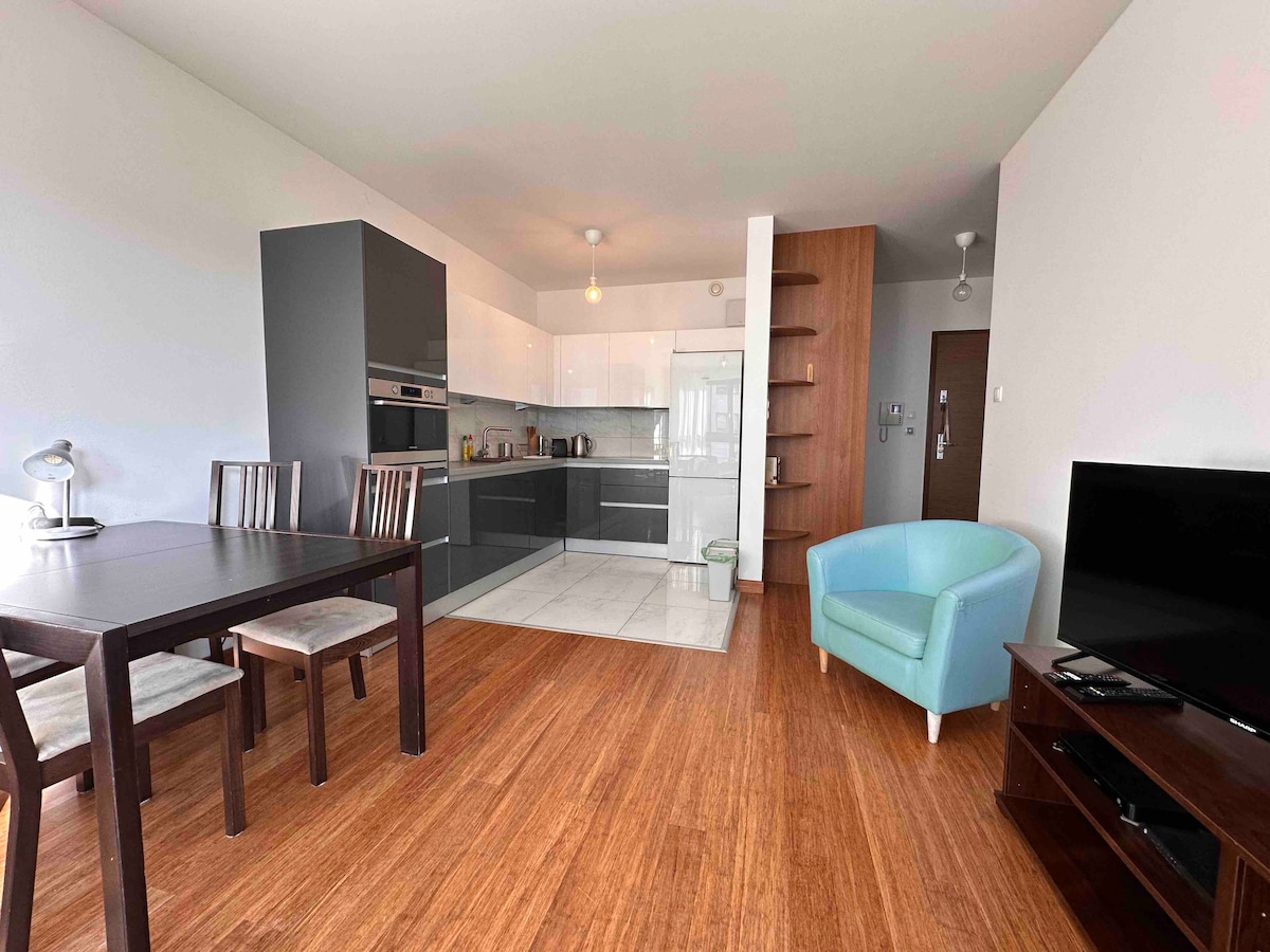Espacio moderno y acogedor con capacidad para un máximo de 4 huéspedes. Con un diseño de planta abierta, el estudio combina a la perfección el dormitorio, la sala de estar y la pequeña cocina. Disfruta de la terraza de la azotea, el gimnasio, el espacio de coworking y la sala de juegos para niños en el edificio. A poca distancia a pie: casco antiguo a 10 minutos, Museo de la Segunda Guerra Mundial a 5 minutos, la iglesia de Santa María, la noria Amber Sky y el astillero Gdanski a un paso de distancia. ¡Elige el alojamiento adecuado en Gdansk!
