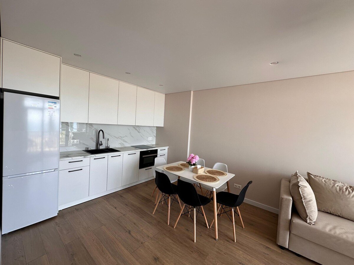 Espacio acogedor y moderno, hecho en colores claros. Los techos altos y las ventanas grandes permiten que la luz natural llene cada rincón del espacio, dándole espacio. Este departamento es perfecto tanto para familias como para amigos. Todas las instalaciones están decoradas pensando en los estándares de diseño moderno, lo que garantiza la armonía y la funcionalidad. Una de las ventajas de este apartamento está cerca de la playa. A solo 10 minutos a pie te encontrarás en la costa arenosa. Estas departamentos son nuevas.
