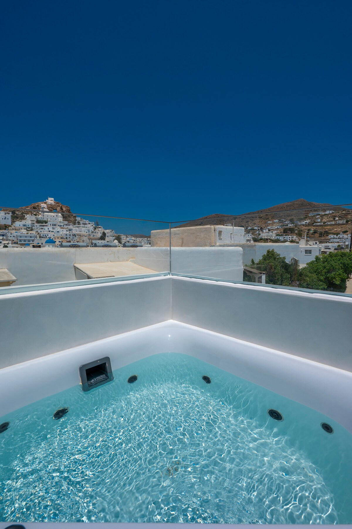 Crea momentos inolvidables con familiares o amigos en tu espaciosa zona exterior con jacuzzi o relájate en tu sala de estar interior. Suite de un dormitorio de 45 metros cuadrados con capacidad para un máximo de 5 huéspedes. Cuenta con una cama tamaño queen, 3 camas individuales de piedra de diseño, baño con ducha de efecto lluvia, cocina equipada y 2 balcones. Smart TV y wifi de alta velocidad en todas las áreas. La distancia desde el puerto de Íos es de 2 km, así como a la playa de Mylopotas. El casco antiguo de Ios está a solo 150 metros.