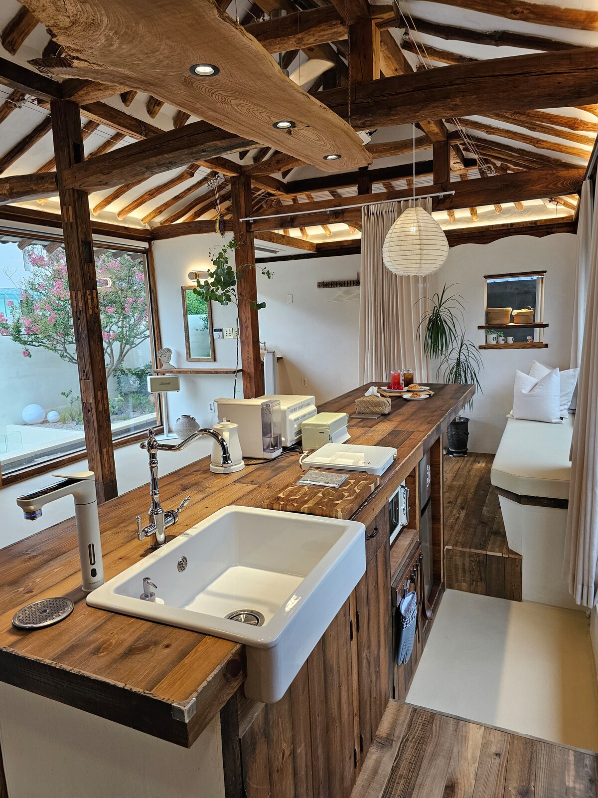 Este es un espacio donde las familias pueden alojarse mientras están en Andong. El interior está diseñado para evitar daños utilizando madera natural y asientos individuales. Para tu comodidad, hay un amplio salón y dos baños. Hay 2 dormitorios individuales y un dormitorio adicional con edredones y mantas. Se incluyen microondas, mininevera, dos aires acondicionados sin ventilador con purificadores de aire, un televisor 4K de 75 pulgadas y conexión Wi-Fi. Un anexo espacioso, separado por piedra natural, alberga un comedor y una sala de té.