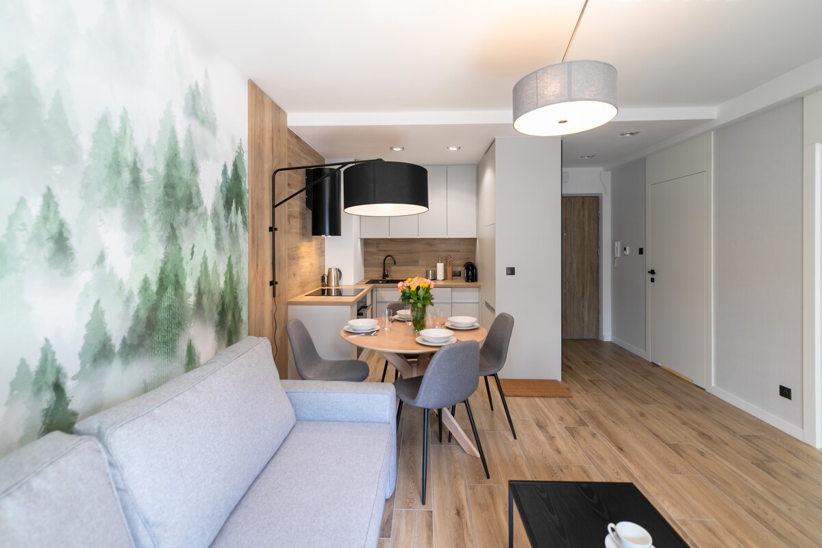 Una sensación de comodidad es la base para un descanso exitoso. En el espacio de más de 30m2, hemos colocado todo lo necesario: un recibidor con armario empotrado, un dormitorio (cama de matrimonio o dos camas individuales disponibles) con un escritorio, que también sirve como tocador, y un baño. La cocina americana con comedor completa el conjunto. No se preocupe – nos encargamos de un gran espacio de almacenamiento. Hay suficiente espacio tanto para un entusiasta de Beskids como para un ratón de biblioteca. Las suites Classic son una propuesta perfecta para dos.