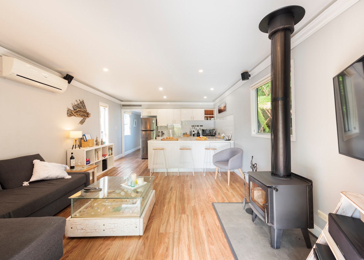 Casa de playa original renovada en un tranquilo callejón sin salida contiguo al arbusto natural. Despiértate con el sonido del surf y vistas al mar. Pasea hasta la idílica playa de Wombarra, a 200 metros por carretera o menos por la pista del monte. Salón interior/exterior, aire acondicionado y calefacción, 3 dormitorios (más sofá cama) y 2 baños nuevos, cocina/comedor/salón y sala de TV independiente. Una pareja vive en el apartamento independiente de la abuela y puede ayudarte si es necesario. Una escapada maravillosa, a 75 minutos del distrito financiero de Sídney. Ideal para parejas, familias o grupos pequeños.