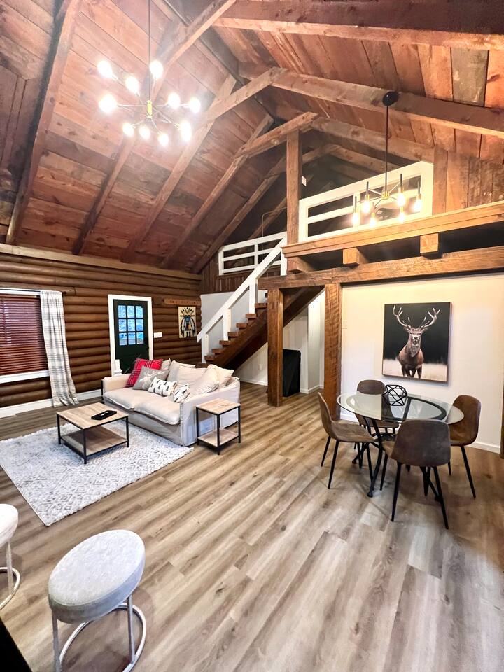 Estacionamiento privado con un puente peatonal de 30 pies con vistas a un arroyo para llevarte a la cabaña. Dormitorio queen en la planta baja; escalera de caracol te lleva a tu dormitorio queen loft; un baño completo; cocina completa; TV/WIFI; hamaca loft interior; porche cubierto alrededor; área de ducha al aire libre cubierta de árboles con bañera de hidromasaje; porche trasero de comedor cubierto. Gran zona de fogón con leña seca. Gran hamaca al aire libre de 12 pies x 12 pies junto al pozo de fuego. Parrilla de carbón Park Series en el exterior.