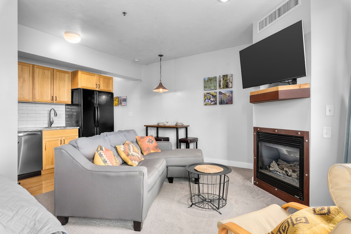 Estudio abovedado en planta superior a 1,5 millas de la estación de esquí y de la calle principal (a unos 5 minutos) de 360 pies cuadrados. El autobús GRATUITO te lleva a centros vacacionales/compras. TV inteligente de 60 pulgadas, suelos de madera, chimenea de gas, PEQUEÑA cocina americana, cama tamaño king (2 plazas) y sofá cama de tamaño completo con colchón de espuma viscoelástica (1 plaza). Jacuzzi abierto todo el año. Piscina abierta durante los meses de verano. Restaurantes a poca distancia a pie. Tendrás que subir un tramo de escaleras para acceder. ¡Quiero que mi estudio se sienta como tu hogar lejos de casa!