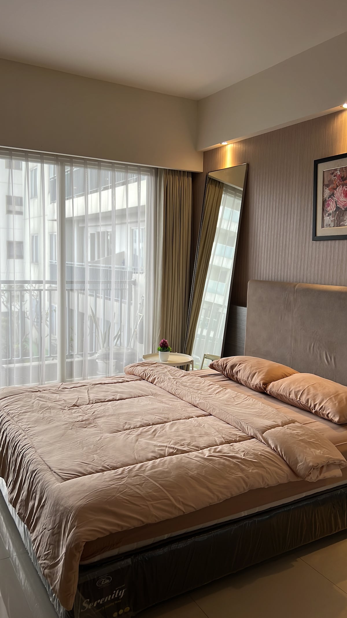 Apartamento de 1 dormitorio con vistas al atardecer desde el balcón del noveno piso en Dago Suites Bandung. Damos la bienvenida a parejas casadas, viajeros solos, familias pequeñas y viajeros de negocios. Nuestro alojamiento tiene una cama tamaño queen y dos colchones adicionales en el suelo. El alojamiento tiene capacidad para un máximo de 4 huéspedes y está equipado con: - Wifi de hasta 20 Mbps. - Televisor de 42 pulgadas con Smart TV Xiaomi Stick con Netflix. - Aire acondicionado. - Calentador de agua. - Dispensador de agua. - Microondas. - Estufa eléctrica. - Refrigerador - Arrocera