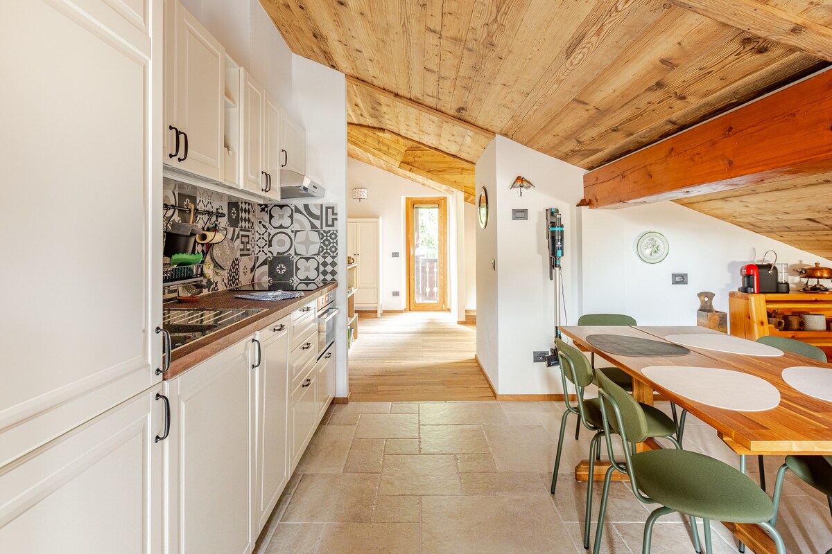mansardina premium ideale per singles avventurosi e/o coppie di innamorati, a due passi dal centro del paese. Open space bi zona composto di un ampia e attrezzatissima cucina dotata di piano di cottura a induzione, forno combinato microonde/grill, lavastoviglie, frigo e surgelatore per invitare a pranzo fino a 6 persone. Nella zona living, oltre al letto matrimoniale troverete anche un ospitale divano/letto matrimoniale di emergenza. Bagno con doccia più due balconi esposti ai due soli.