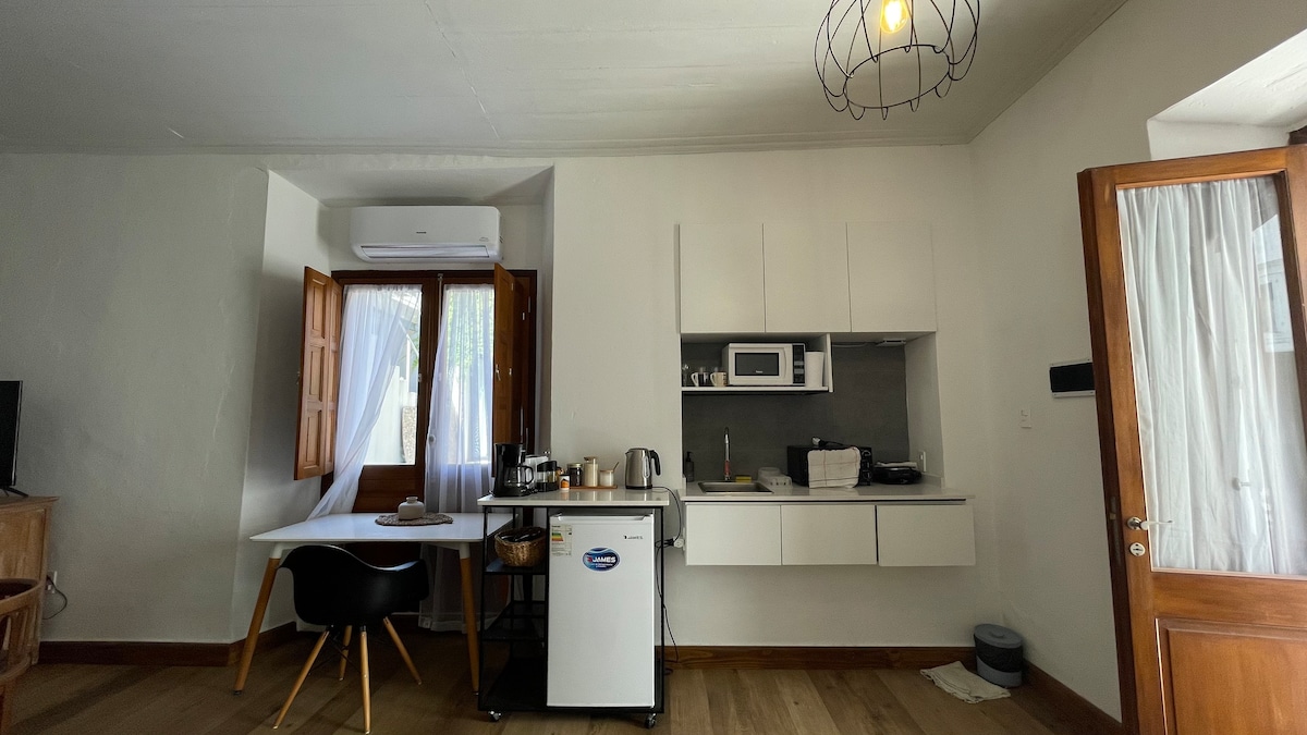 Apartamento "2" dentro de la antigua casona "El Patio de las Glicinas" totalmente reciclada. Loft con living y cocina integrados, y dormitorio en el piso superior. Ideal para parejas. Zona muy tranquila, segura y silenciosa frente a la plaza y cerca de tiendas y bancos, a pocas cuadras del barrio histórico y a una cuadra de la playa. Totalmente amueblado, con aire acondicionado en ambas plantas, televisor con reproductor Chromecast y cocina equipada con horno, microondas, cafetera y tostadora.