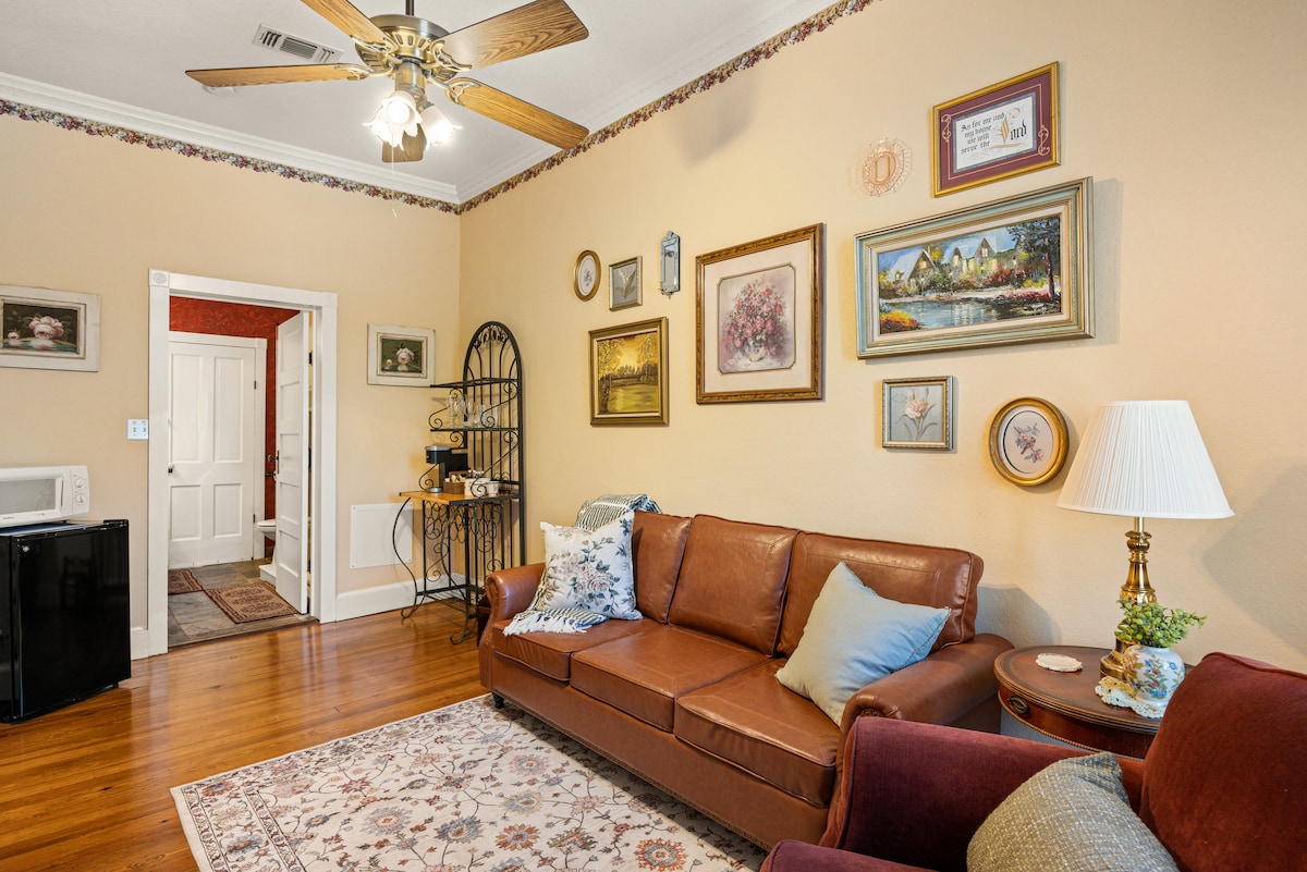 Amplio estudio con techos enormes, suelos de madera y un balcón Juliette con vistas a Main Street. Dormitorio y sala de estar bien equipados, baño completo y cocina americana cuidadosamente equipada. La ubicación ideal fomenta los paseos por la ciudad entre las tiendas, salas de degustación, museos, restaurantes y locales de música en vivo. Mientras que una plaza de aparcamiento privado ofrece libertad para explorar las afueras de la hermosa región montañosa con sus fantásticas bodegas, flores silvestres, Luckenbach y el Parque Estatal Enchanted Rock.